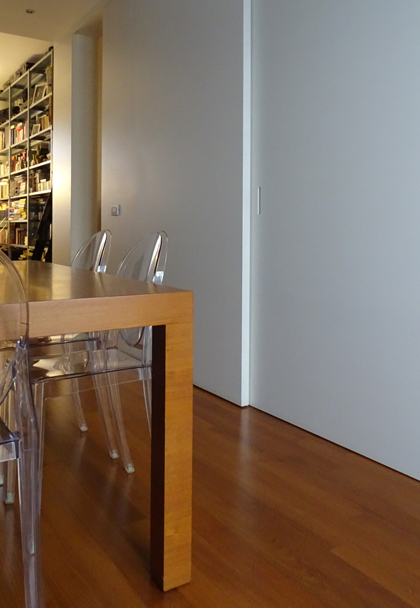 Ristrutturazione di appartamento al piano terreno di una palazzina degli anni ’50.Con il progetto si amplia la zona giorno eliminando le porte e realizzando aperture a tutta altezza. Viene disegnata su misura la parete in pannelli di rovere laccata a pori aperti color gesso che nasconde la porta di collegamento con la zona notte e ampie armadiature. L’area pranzo ruota attorno al tavolo quadrato in teak 180X180cm disegnato su misura così come l’elemento contenitore sospeso in ferro verniciato grigio antracite. Dalla zona pranzo e dalla cucina si accede a un piccolo giardino privato, deliziosa prosecuzione degli spazi interni.