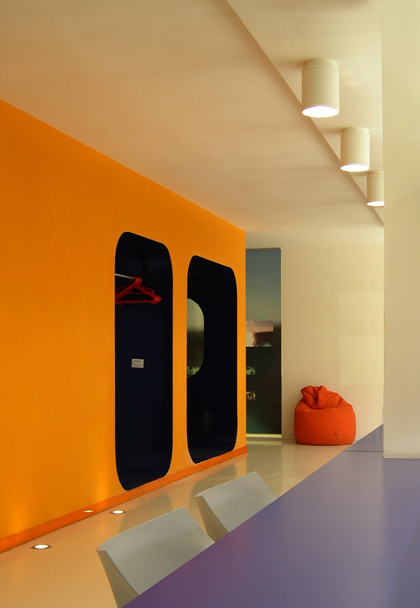 Ristrutturazione di salone da parrucchiere in palazzo degli anni ’60. Il progetto è partito dalla volontà del committente di avere un ambiente che evocasse suggestioni e colori degli anni ’70. Lo spazio di 100mq è stato reso totalmente aperto demolendo tutte le tramezzature esistenti ed è stato realizzato un pavimento continuo in resina. Il fulcro del progetto è il lungo bancone su misura laccato blu che si sviluppa per 10 metri mentre le varie funzioni del salone sono definite da pareti in cartongesso modellate e colorate.